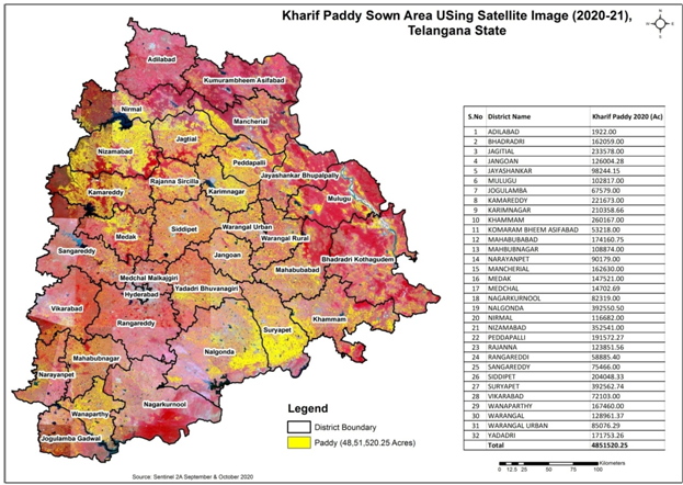 - Kharif Rice: Acreage estimation of Kharif rice in major Rice growing districts of Telangana for State Forecast / District forecast.
