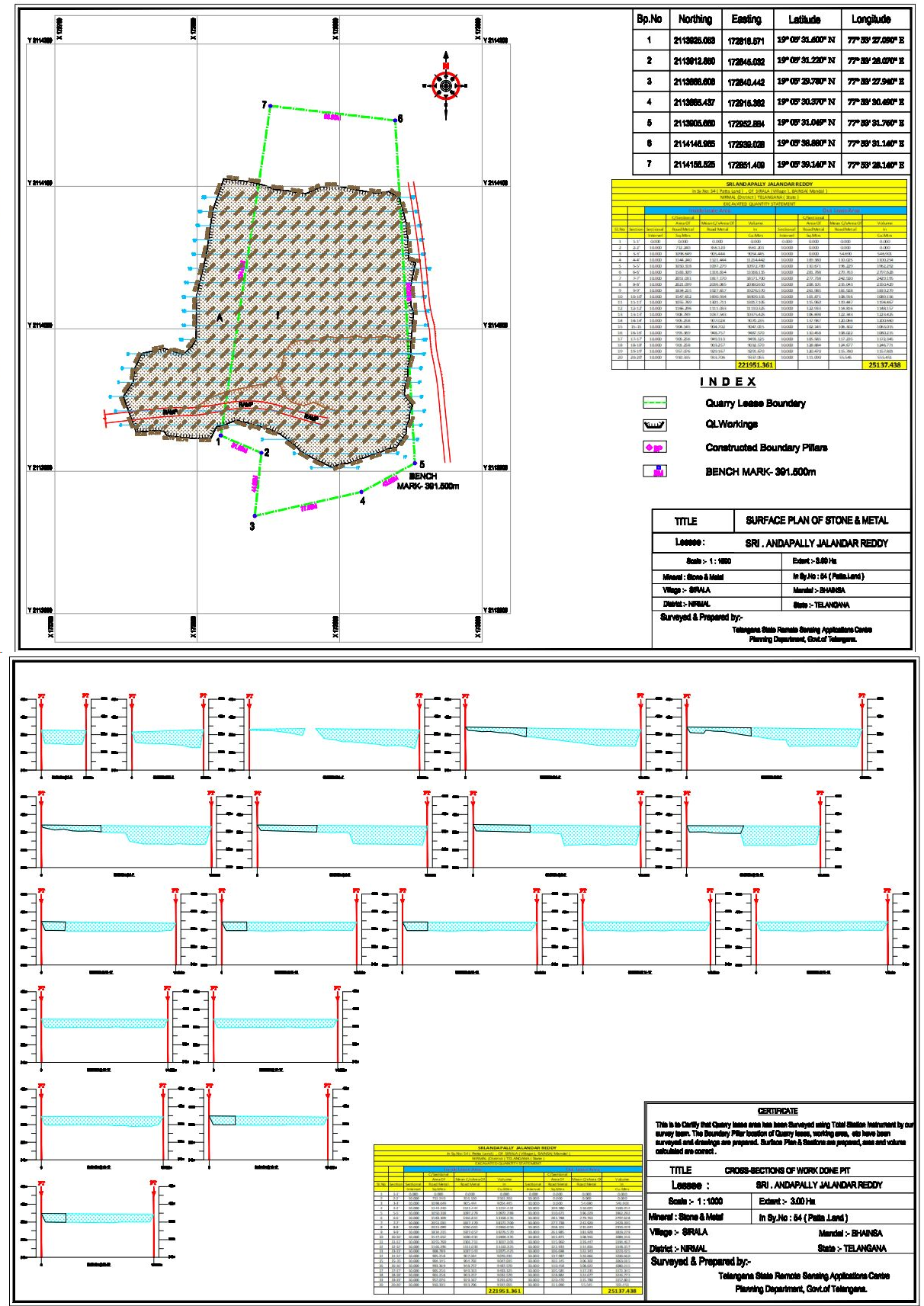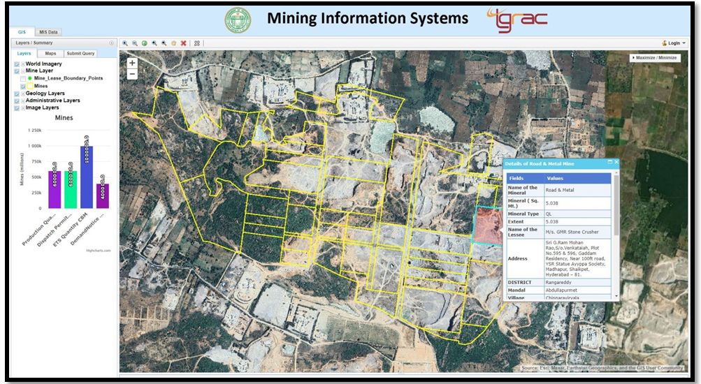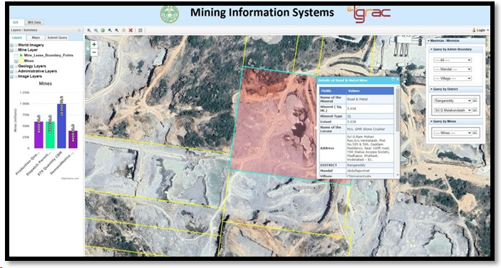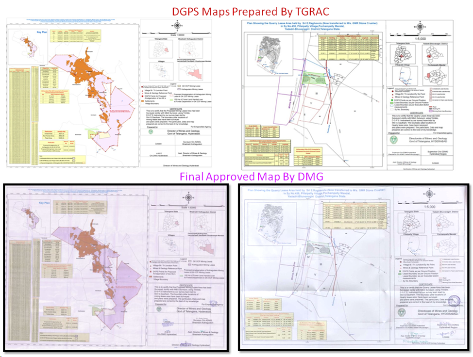 M/s. Singareni Collieries Company Limited, approached TRAC and given a project on "Demarcation of PL/ML/QL/Mineral Blocks using DGPS & Total station & Geo referencing with Cadastral maps" for getting DGPS & Total station survey for lease boundaries and mapping of all major minerals and minor minerals in 9 districts in the state. Through this project DMG wants to assess and monitor spatially the actual lease area sanctioned and ground reality of mining activity at present day whereby knowing the deviations in area and locations pertaining to leases in the state. Main emphasis is to generate precise Mining Lease / Prospecting License boundaries on the cadastral map showing survey numbers, which also includes 1.Precise fixation of coordinates of pillars of mining lease with reference to at least three permanent ground features in and around lease boundaries sanctioned .2. Generation of latitude-longitude value for each boundary pillar and ground reference points like Tri-junction, Bi- junction, Mines and Geology reference points using DGPS survey. 3.Integration of Mining Lease / Prospecting License boundary with vectorized & geo-referencing cadastral map 4. Showing Mining Lease / Prospecting License boundary on latest high-resolution satellite data with a buffer of 500 m.5. Creation of layer-wise GIS database comprising of i) Mining Lease / Prospecting License boundary ii) Geo referenced cadastral map iii) Base map details iv) Thematic data.