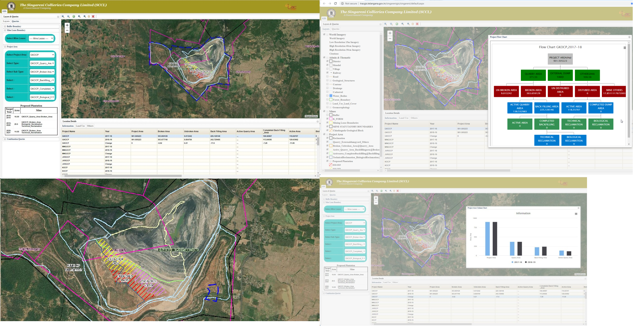 Telangana State Remote Sensing applications centre has been assigned to develop Geo Spatial Web Applications for SCCL on "Coal mine Geographic Information system" for their 16 OC mine leases and other areas using mapping of all layers & themes required for the project. All mine lease boundary pillar points & dynamic mine related LULC feature boundary points (DGPS survey) and other areas boundary points were provided by SCCL. TRAC has to generate all these boundary layers for GIS data base and structured to suit the web section to be hosted .All layers should be shown with back ground latest high resolution satellite imagery. Format for numerical data viewable along with visualizing integrated map hosted in the web has been designed to observe the differences between 2017-18 & 2018-19 of various parameter as per the flow chart given by SCCL. The intention of SCCL is to maintain year wise differences occurring in the mines and generate statistics when ever wanted by higher officers on different levels like year wise, project wise, area wise, single parameter wise. Any further requirement from SCCL to be addressed whenever asked for other data generation.