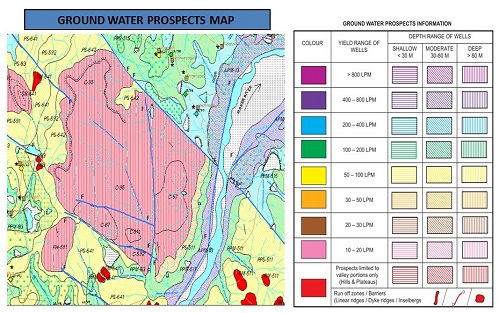 Spatially user can visualizes the Ground Water Prospects information in terms of depth (shallow, moderate and deep) shown with three colour hatching patterns (horizontal, inclined and vertical) and yield shown in seven colours (VIBGYOR - Violet, Indigo, Blue, Green, Yellow, Orange and Red) with simplified legend.