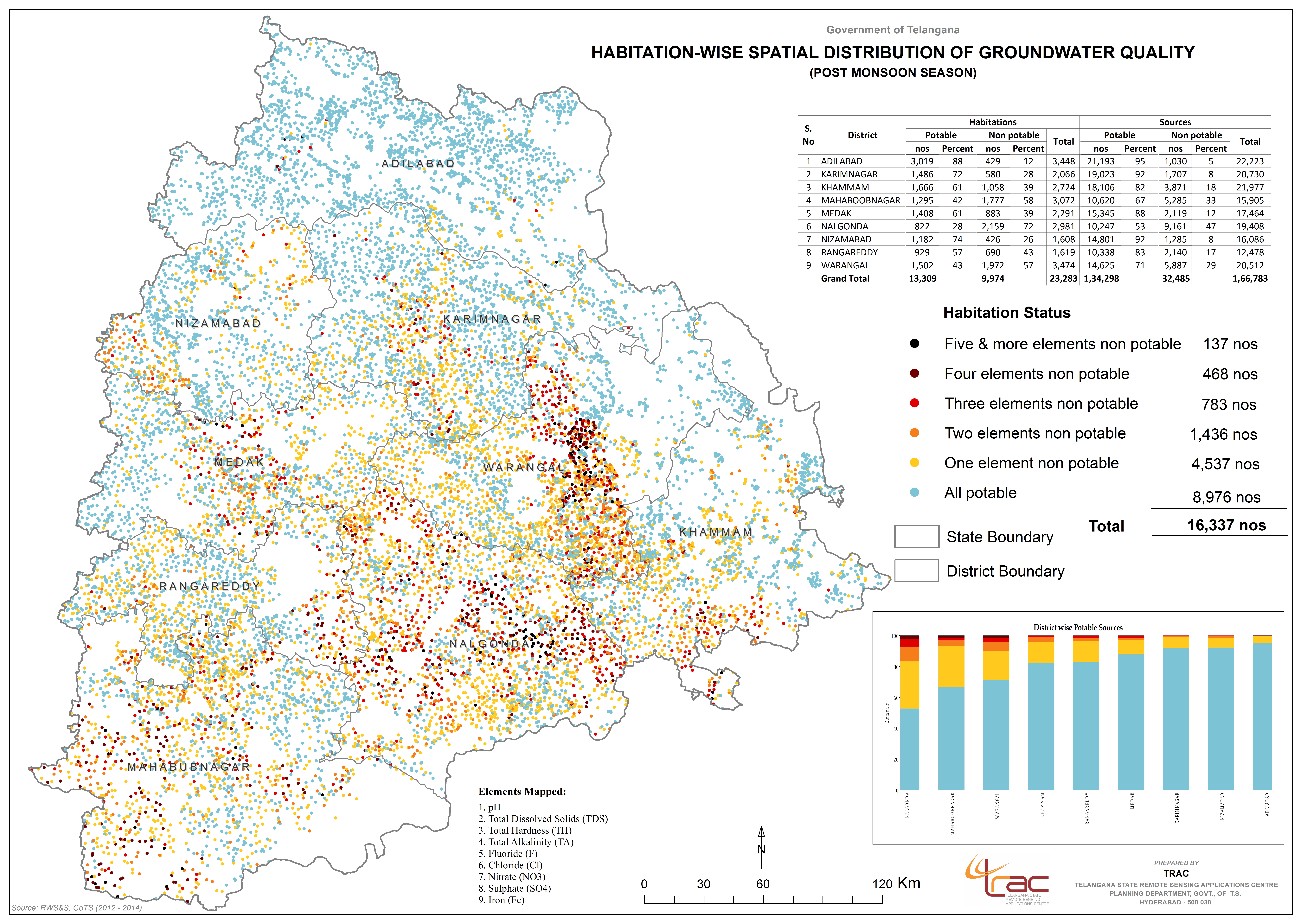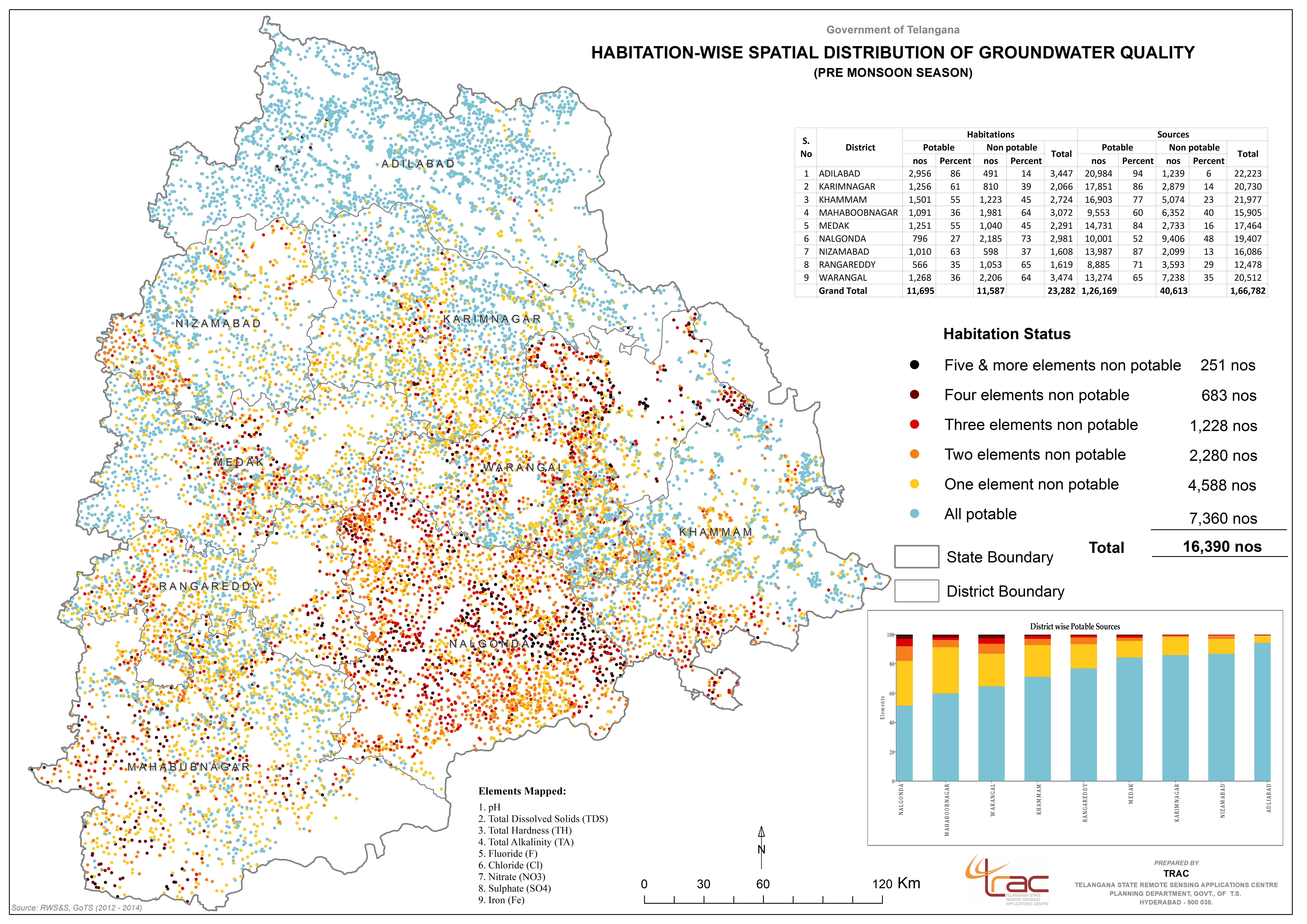Groundwater is the main source of water for domestic, agriculture and industrial uses. Telangana Remote Sensing Applications Centre (TGRAC) in collaboration with National Remote Sensing Centre (NRSC/DoS) and sponsored by Ministry of Drinking Water & Sanitation, Govt. of India has prepared the Ground Water Prospects maps for the state of Telangana. The maps are prepared scientifically by using satellite remote sensing technology with limited field checks on 1: 50,000 scale. The maps show prospective zones for ground water occurrence and tentative locations for constructing recharge structures. The information provided in the ground water prospects maps form a suitable database for narrowing down the target zones and systematic selection of sites for drilling after conducting follow up ground surveys. This information can be utilized by hydrogeologists, Engineers and other private / NGO organizations for ground water development.