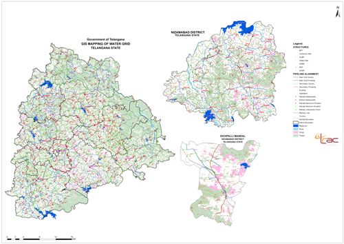 TGRAC has extensively used Remote Sensing Satellite data and GIS techniques in preliminary planning of the project for entire state within a shortest period. The spatial network of the existing Rural Water Supply infrastructure is captured. Using Digital Elevation Model data the elevations of habitations that of surface water source were assessed, Habitations were either connected by gravity pipeline else through pumping pipeline to nearest hillock, from the source. About a total of 18,507 required structures were identified, about 4,430 Km of Main Grid, 44,466 Km of Sub-Grid and 38,506 Km of distribution network was analyzed and extracted. Based on the work of TRAC, estimations were prepared by RWS. Permissions were taken from railway department for identified crossing points of pipeline with Railway line and from the Forest department for the pipeline passing through the forest areas of about 910 acres.