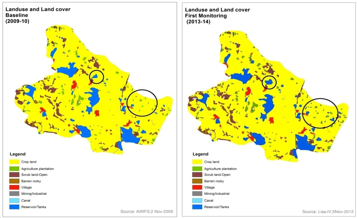 The project envisages carrying out the impact assessment of WDC-PMKSY 2.0 watersheds programme by comparing the pre and post dated satellite data using on screen interpretation using Bhuvan web services and Mobile App. By processing of high resolution satellite data – LISS‐IV and Cartosat, the evaluation report will be generated covering LULC maps, assessment of Drishti photographs and field level activities and estimation of increase / decrease in the Vegetation Vigour using NDVI techniques. There are 35 watersheds in Telangana state. The watersheds have to be monitored for Pre, Mid and Post project stages during 2021-22 to 2028-29 The acquisition of satellite data (Sentinel / Cartosat / LISS IV) and its utilization for the 2021-2022 and 2024-2025 periods are completed for three seasons i.e.